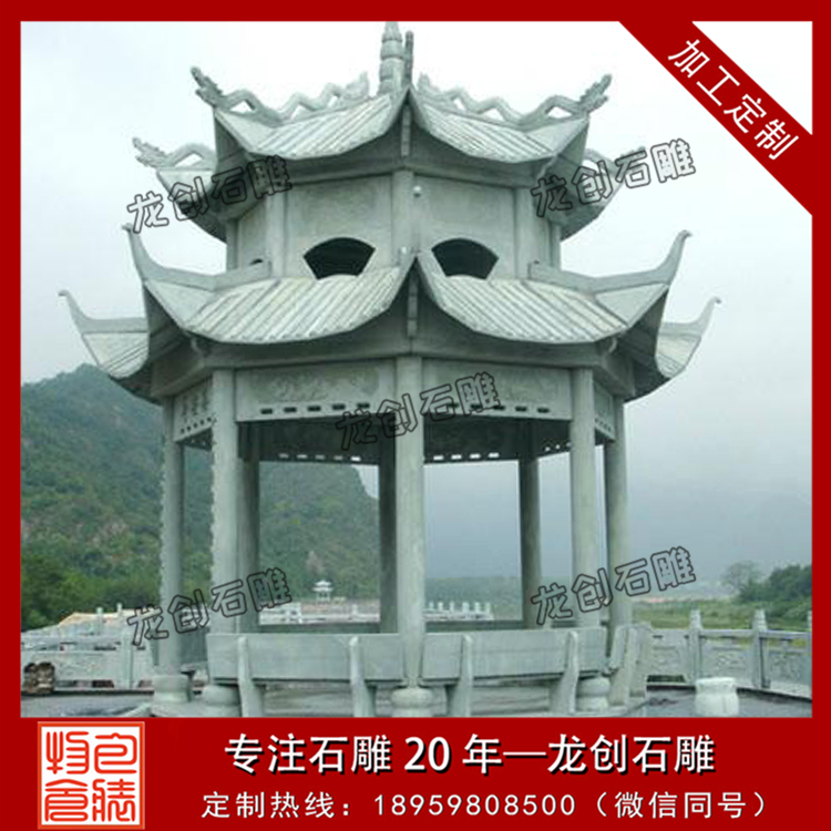 第三,必須通過各種雕刻手法,將石雕涼亭完美地展現出來。這一點是至關重要的。要完成一個石涼亭,有可能要用到圓雕、浮雕等多種手法,如果功夫不到家,是很難獨自完成一個精美的石涼亭的。
