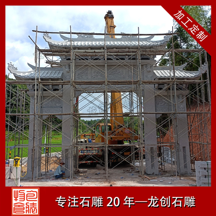 在很多的農村的村口都會有石雕牌坊,也有人稱石門樓,這是一種非常常見的建筑,村口石雕牌坊不僅僅是一個村子文化的象征,同時也是村子非常獨特的景觀,在不同的農村,石雕牌坊會有不同的設計,因此村口石雕牌坊樣式也具有多樣性。以下是村口三門石雕牌坊案例展示: