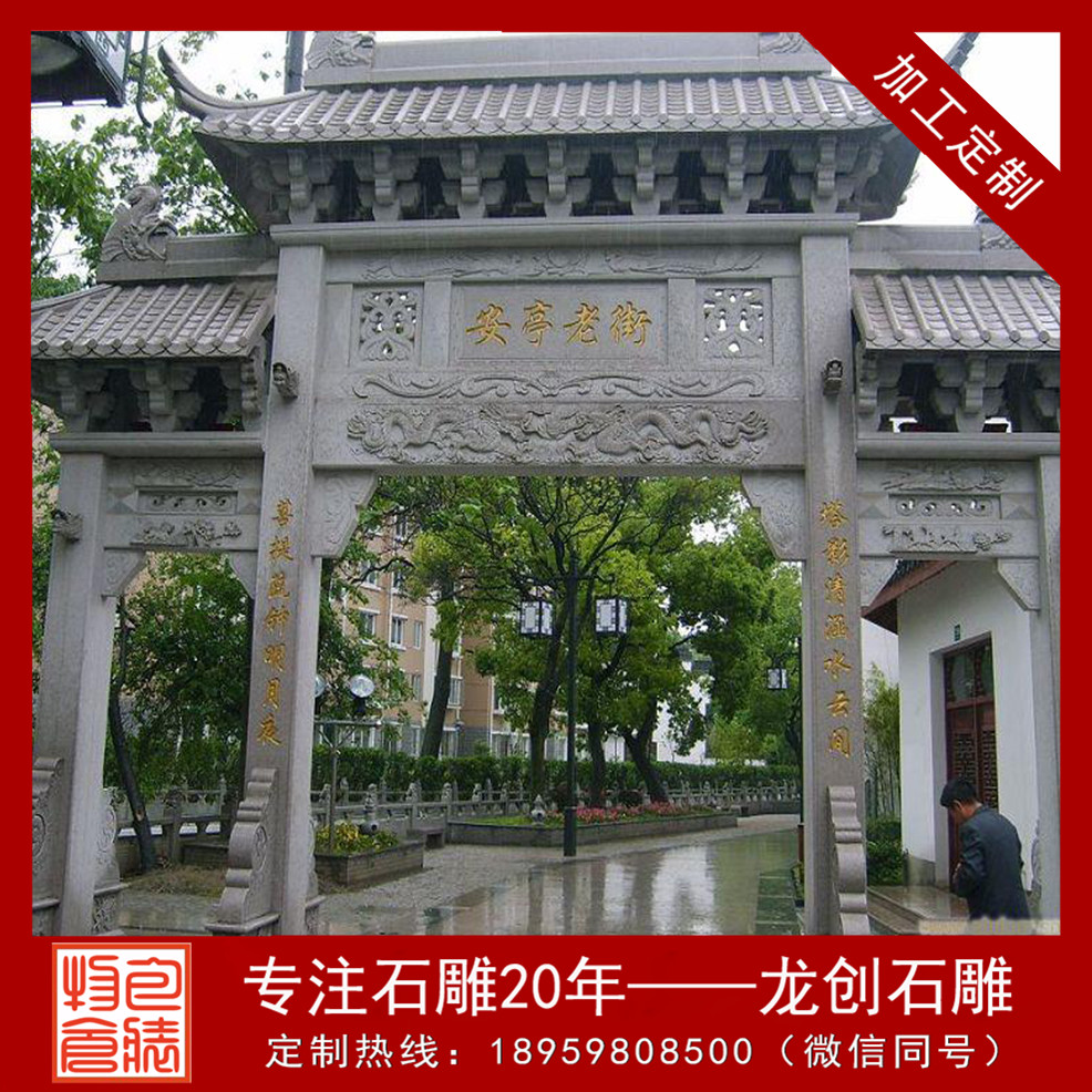人人需求漂亮的環境。愛美之心,人皆有之,這是一個眾所認同的道理。村口石牌坊出于美化和裝飾的需求,環境需求溫馨的環境,環境的管理與改造標志著文化的興旺情況,維護和美化環境成為現代社會人人遵照的原則和共有的追求。人們不只從生態均衡角度,更從心理上努力于發明一個既能滿足生存需求,又能表現肉體表達的文雅環境。因而,村口石牌坊隨之成為整個社會倡導與開展的藝術方式之一。石牌坊制作廠家龍創石雕為您引見村口石牌坊。