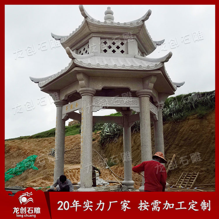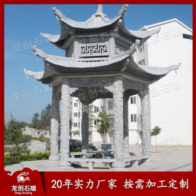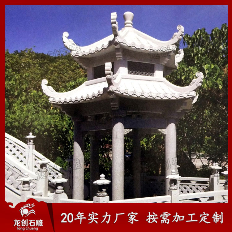 石雕雙層涼亭作為一種景觀建筑,經(jīng)常的與空間環(huán)境作為主題形式出現(xiàn)。這樣我們可以從各個(gè)角度欣賞。但是它又不是一個(gè)實(shí)體,更多地強(qiáng)調(diào)其虛空的內(nèi)部與周圍的空間環(huán)境之間的聯(lián)系,這樣就通過(guò)建筑造型的外在形象,在周圍空間中起到點(diǎn)睛的作用。它追求的是一種整體美、自然美、古典美。