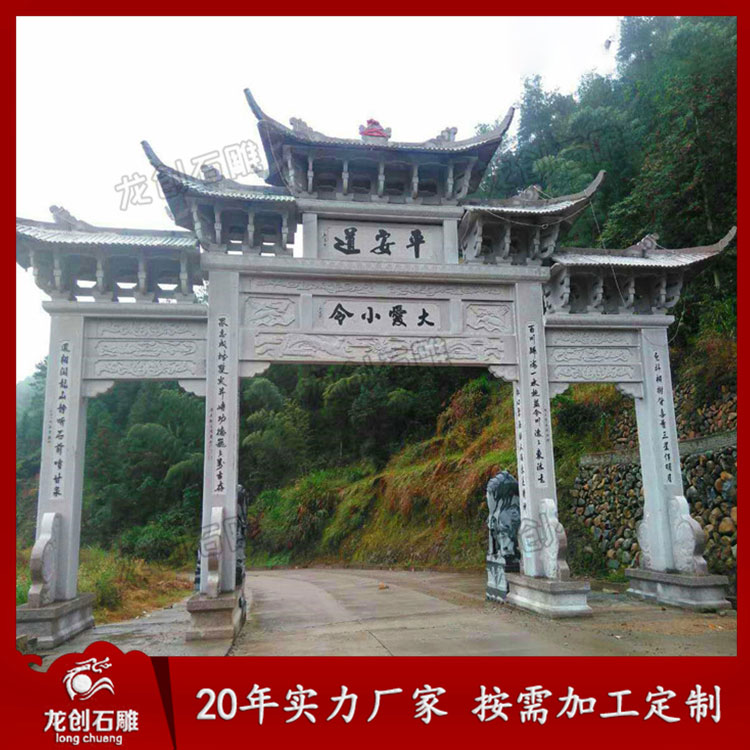 村口牌坊牌樓石雕的興起是一種盛世的象征。村口石牌樓體現了農村經濟繁榮、設施完善、環境優美、文明和諧的社會主義新農村的核心價值,這也是社會主義新農村建設的成功見證之一。