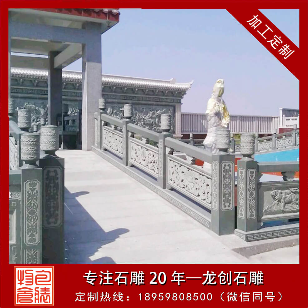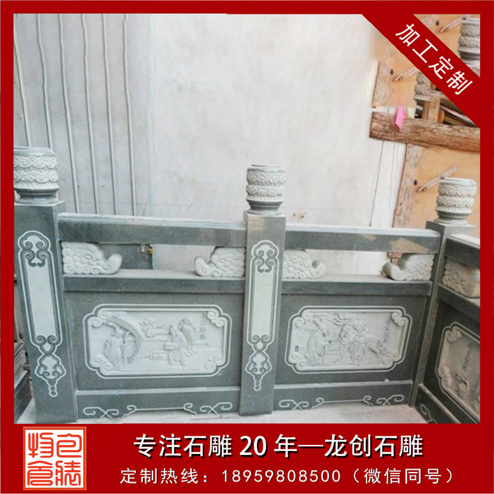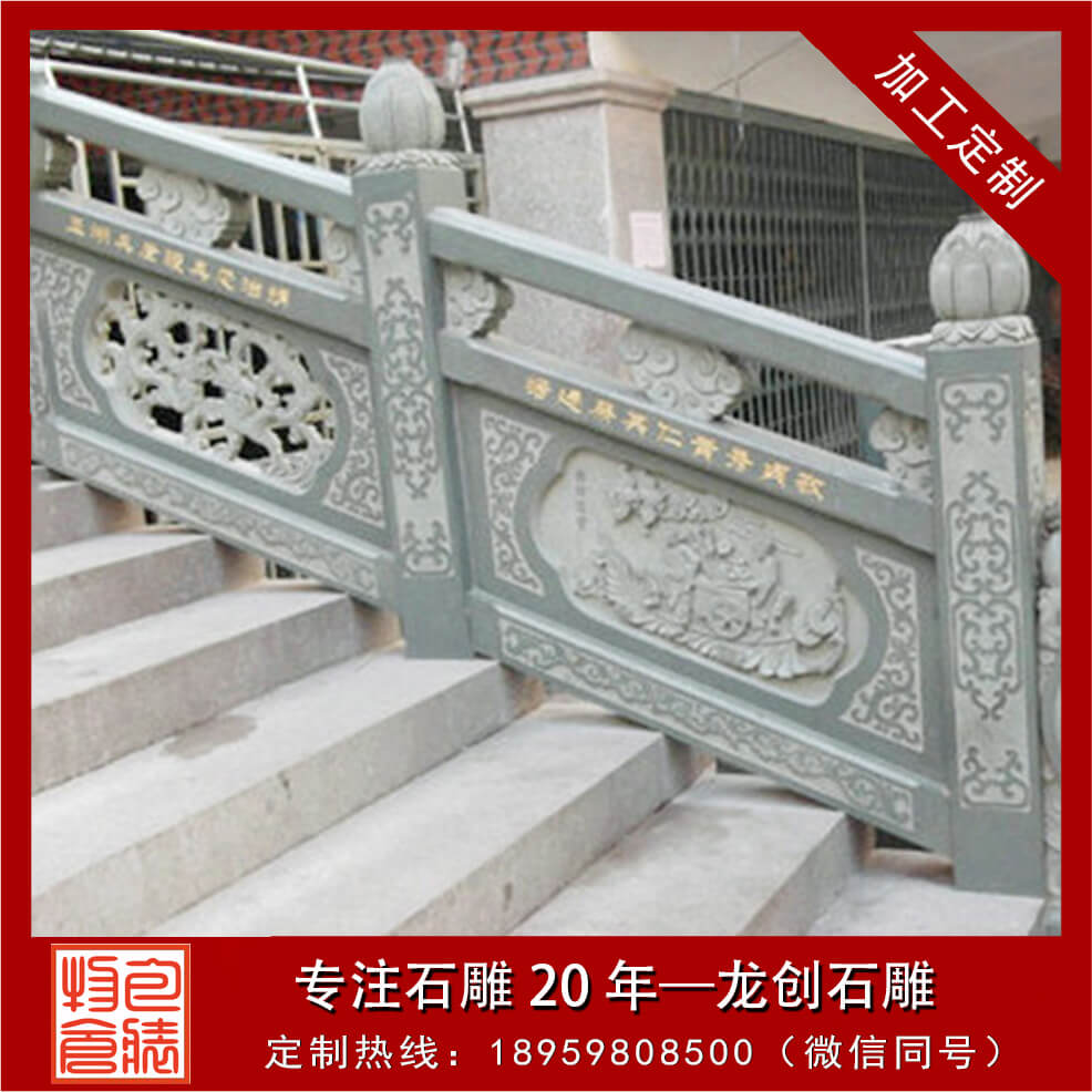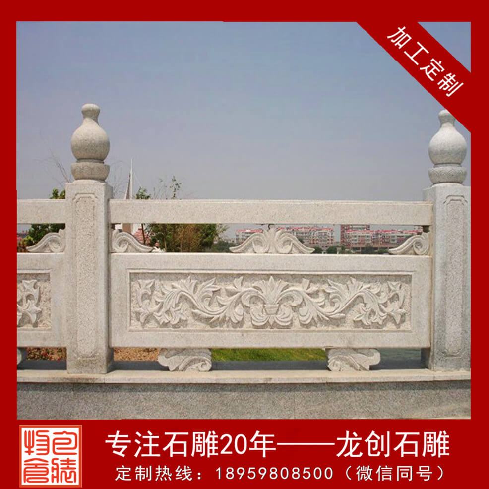 石頭欄桿一般出現(xiàn)在古建筑大殿周圍、橋面、路面上,起到保護行人安全外,石頭欄桿還可裝飾環(huán)境,又能豐富人們的活,陶冶人的情操,給人以美的享受。石頭欄桿、石頭欄桿的構(gòu)成石頭欄桿有柱頭、立柱、扶手、花托、欄板、地鋪幾部分組成。透空的帶花格或圖案的實心欄桿,也有實心的欄板局部透空或全部不透空的欄桿。